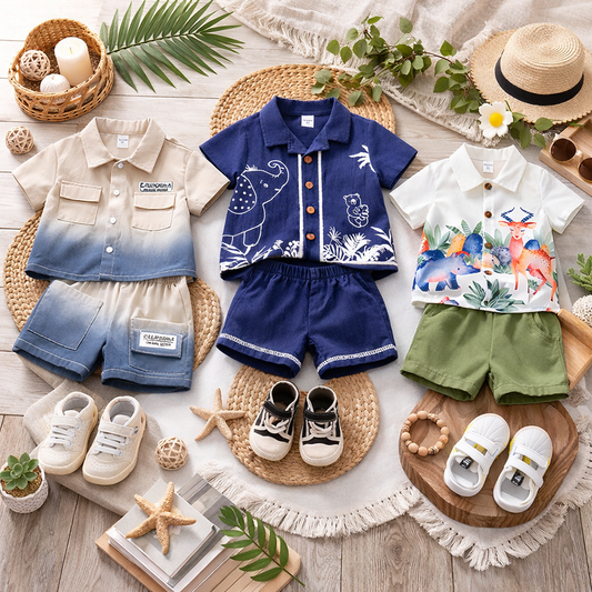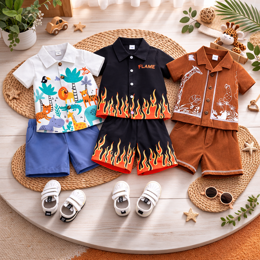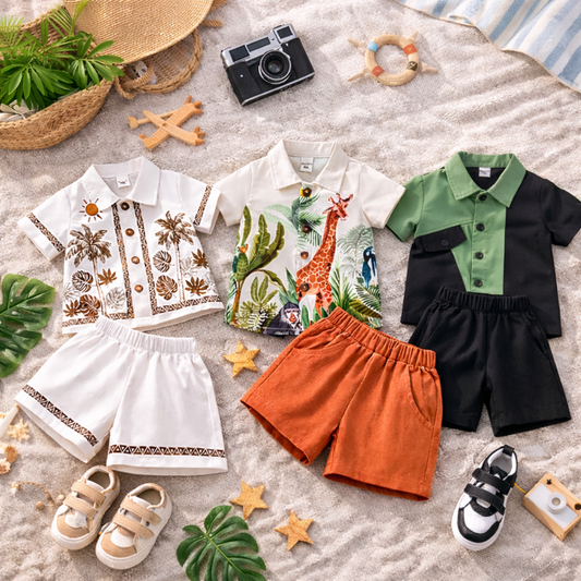 Venutaloza Baby Boy Palm Tree & Animal Printed Short Sleeve Shirt And Shorts Two Piece Set.