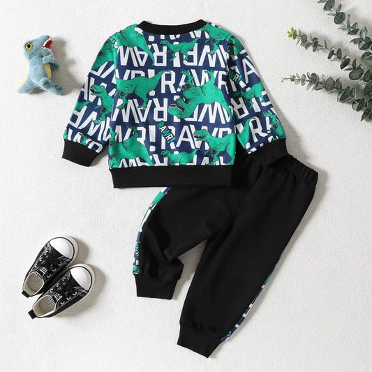 Venutaloza Boys Letter Dinosaur Print Graphic T-shirt & Pants Two Piece Set For Boys.