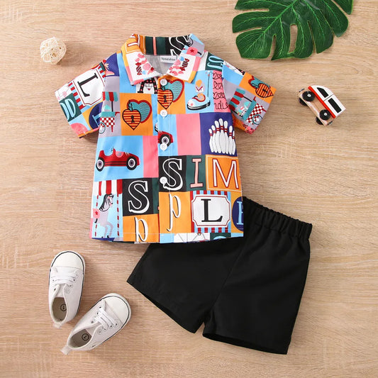 Boys Two-Piece Set Coconut Tree Collar Shirt and Comfortable Shorts, for Outdoor.