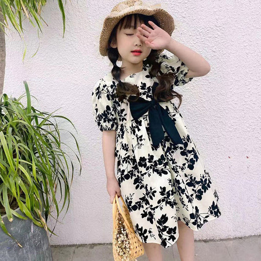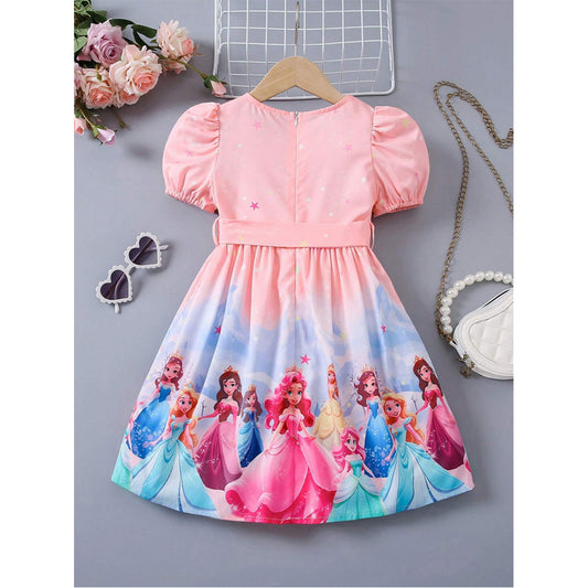 Baby Princess Printed Puff Sleeve Dress With Bowknot Decoration For Girls.