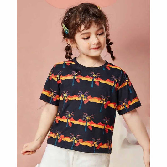 Venutaloza Tropical Print Neck Color Block T-Shirt For Baby Girl's.