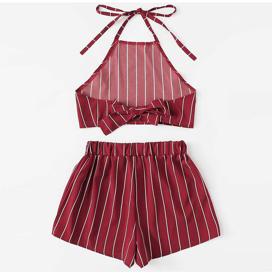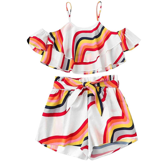BabyGirl's Off Shoulder Lining Top Sleeveless And Stripes Shorts Set For Kids.
