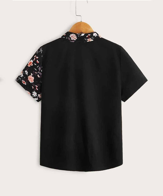 Venutaloza Black Floral Panel Button up Short Sleeve Shirt For Boy.