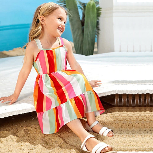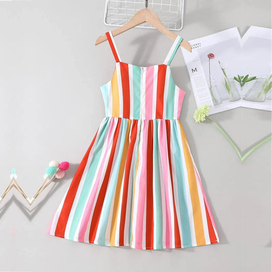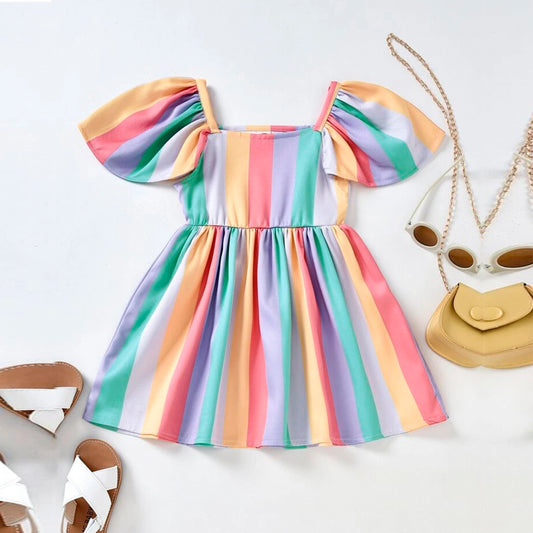 Babydoll Princess Rainbow Stripe Cap Designer Frocks for Baby Girl.