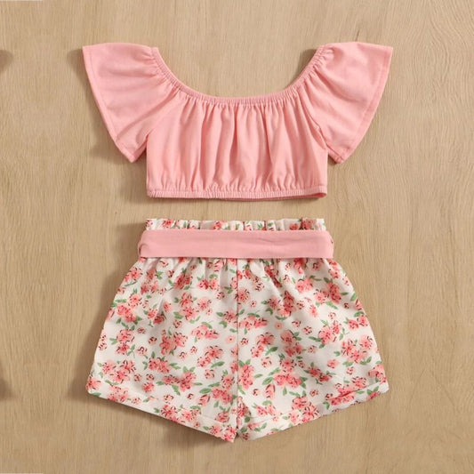 Crop Pink Floral Stylish Butterfly Sleeve Top And Belted Shorts For Baby Girls.