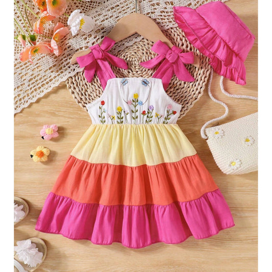 Baby Girl's Sweet And Cute Flower Print Spaghetti Strap Dress With Big Bowknot Frocks for Kids.